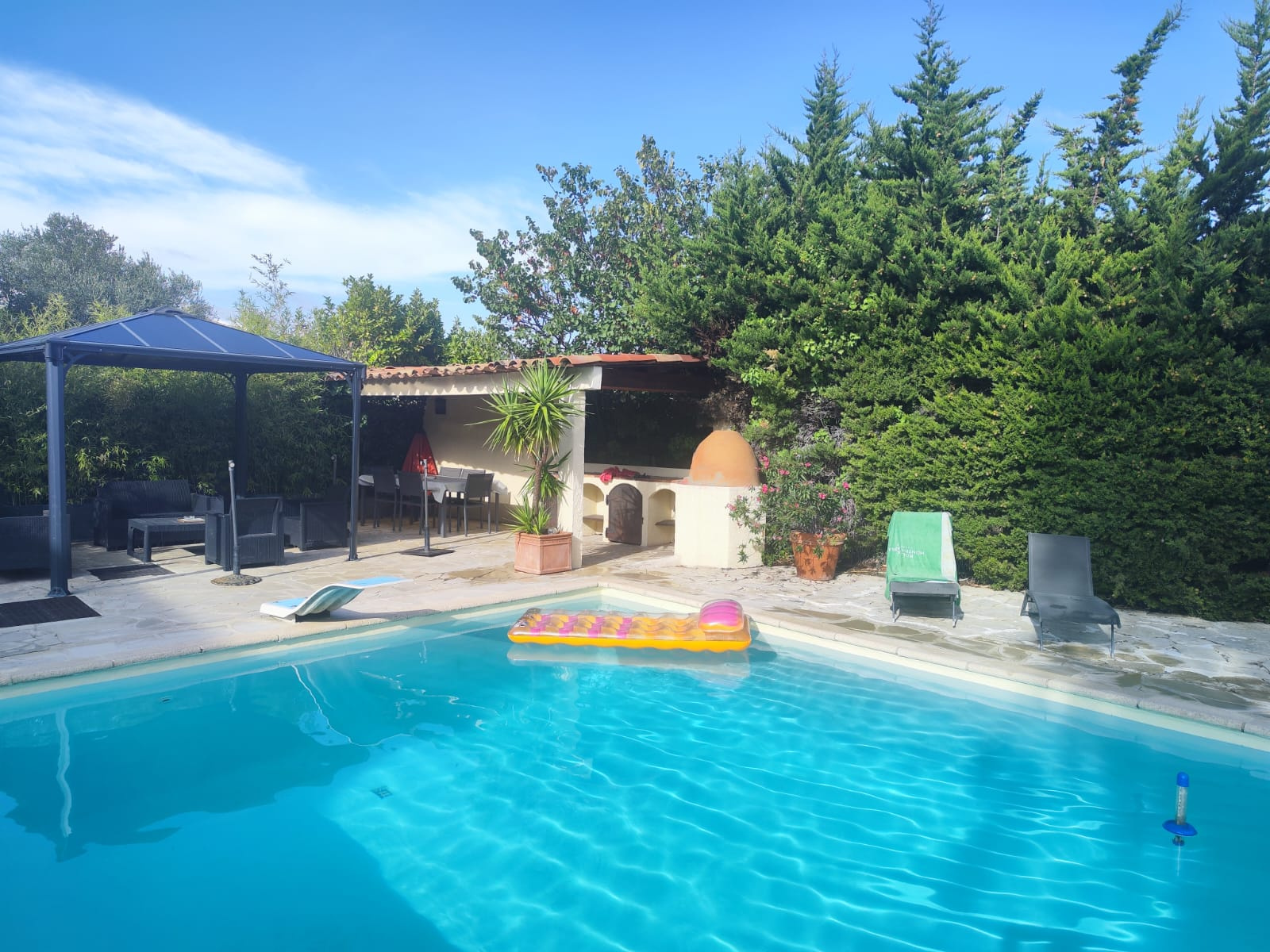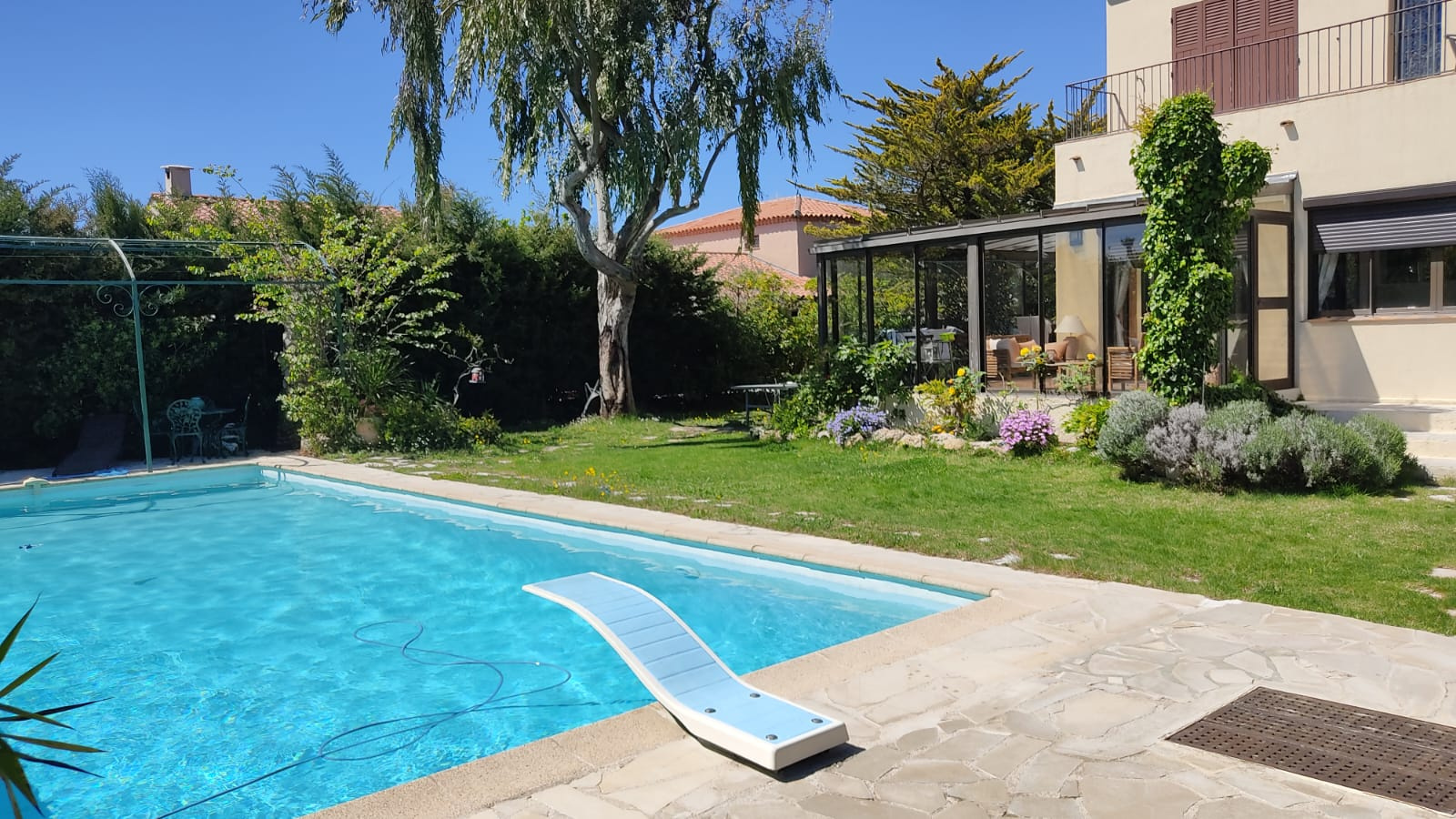 Le jardin plat et joliment agrémenté dispose d'une magnifique piscine (16X6), un bel espace Pool House avec cuisine d'été et four à pizza et nombreuses terrasses ensoléillées et ombragées.