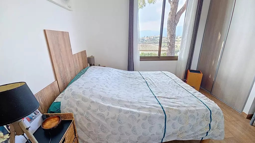 À l’étage, magnifique suite parentale avec rangements intégrés et terrasse tropézienne profitant vue imprenable sur les collines d'un côté et la mer de l'autre, une chambre lumineuse (actuellement utilisé en bureau) ainsi qu’une salle d’eau avec WC complètent cet espace.