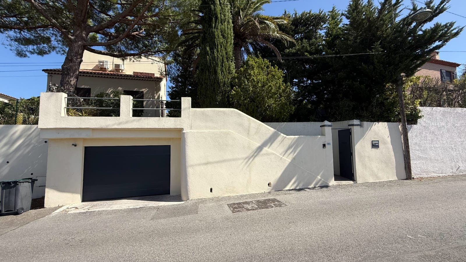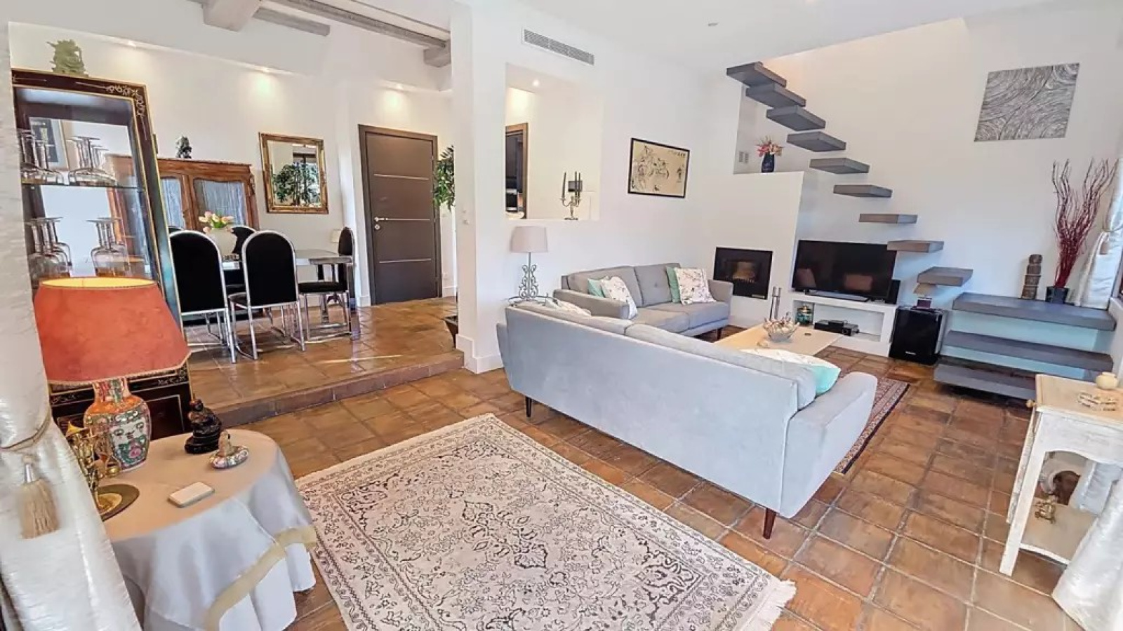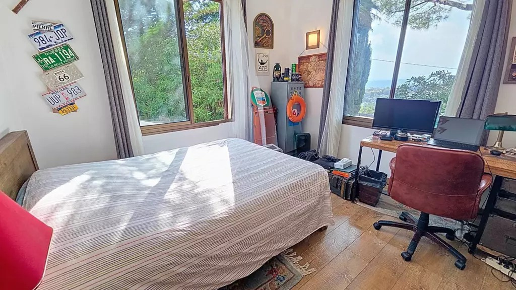 À l’étage, magnifique suite parentale avec rangements intégrés et terrasse tropézienne profitant vue imprenable sur les collines d'un côté et la mer de l'autre, une chambre lumineuse (actuellement utilisé en bureau) ainsi qu’une salle d’eau avec WC complètent cet espace.