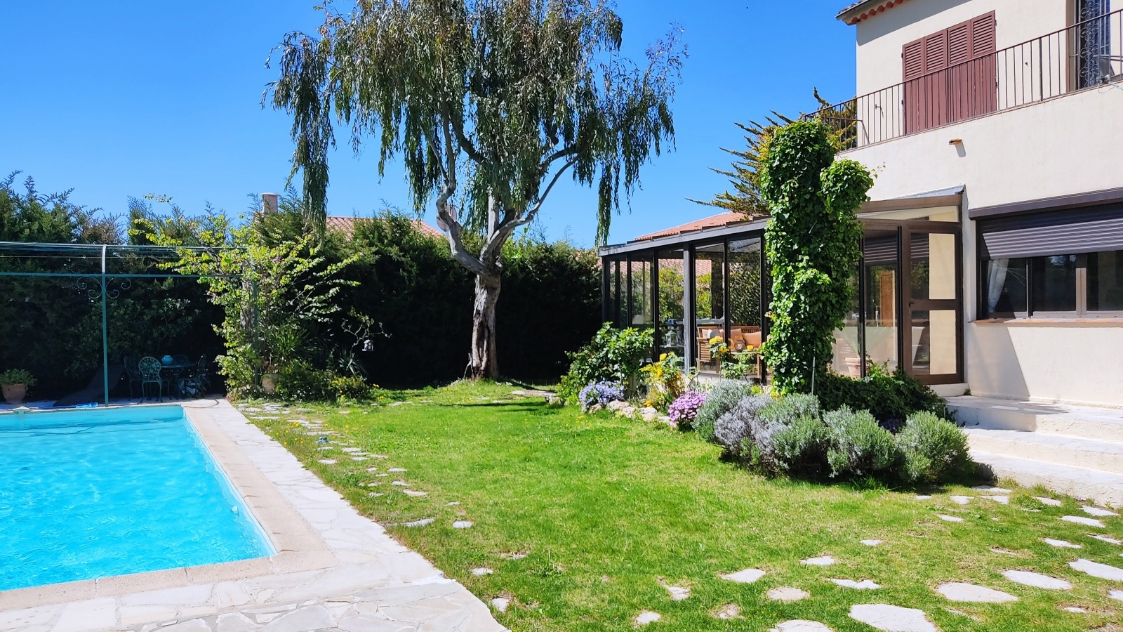 Le jardin plat et joliment agrémenté dispose d'une magnifique piscine (16X6), un bel espace Pool House avec cuisine d'été et four à pizza et nombreuses terrasses ensoléillées et ombragées.