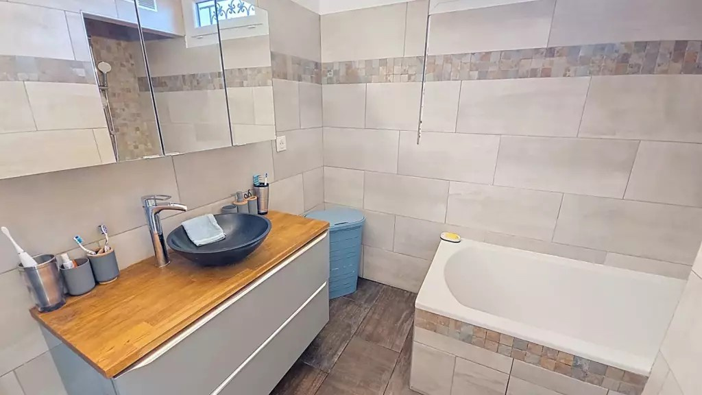En entresol, une pièce de vie de 18 m² très facilement transformable en deux pièces indépendant (actuellement salle de gym), buanderie, salle de douche avec fenêtre , WC indépendant et une grande cave.
