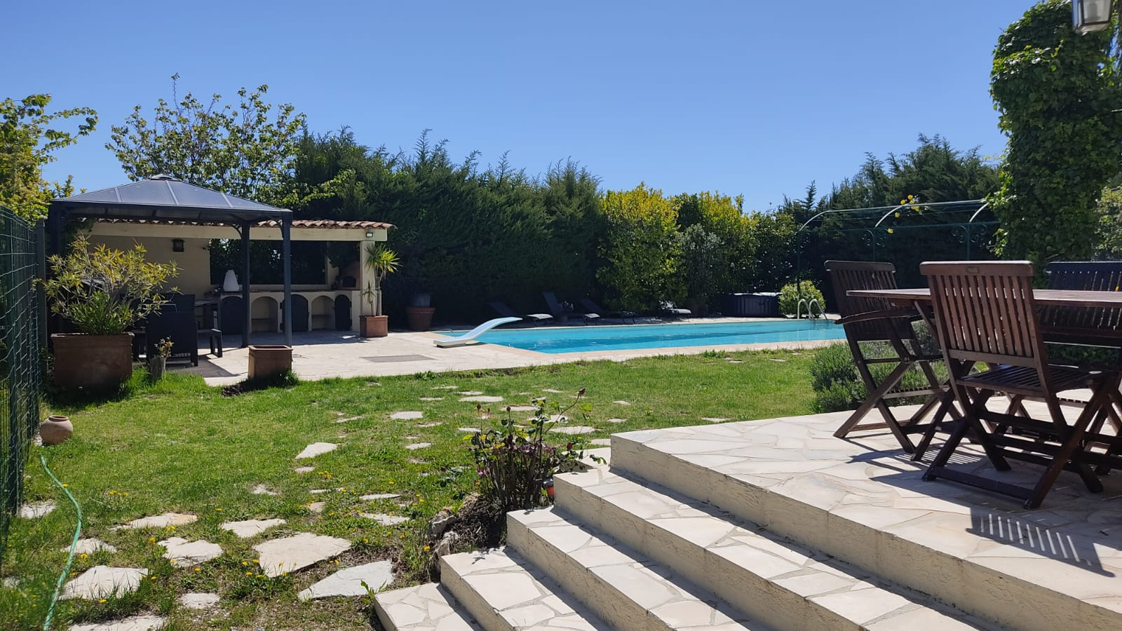 Le jardin plat et joliment agrémenté dispose d'une magnifique piscine (16X6), un bel espace Pool House avec cuisine d'été et four à pizza et nombreuses terrasses ensoléillées et ombragées.