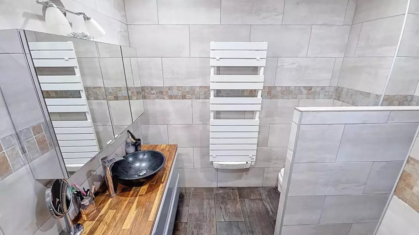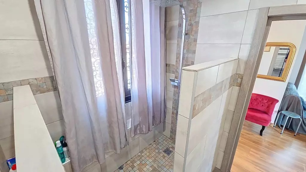 En entresol, une pièce de vie de 18 m² très facilement transformable en deux pièces indépendant (actuellement salle de gym), buanderie, salle de douche avec fenêtre , WC indépendant et une grande cave.