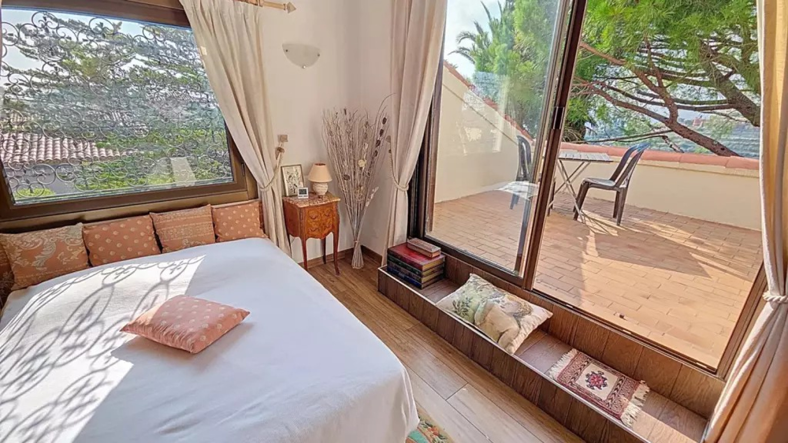À l’étage, magnifique suite parentale avec rangements intégrés et terrasse tropézienne profitant vue imprenable sur les collines d'un côté et la mer de l'autre, une chambre lumineuse (actuellement utilisé en bureau) ainsi qu’une salle d’eau avec WC complètent cet espace.